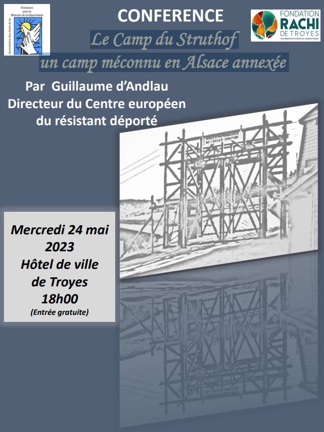 Le 24 mai prochain, Guillaume d'Andlau, directeur du Centre européen du résistant déporté, présentera l'histoire de l'ancien camp de concentration de Natzweiler, plus connu en France sous le nom de « camp du Struthof ». Organisée en partenariat avec l'Association des amis de la Fondation pour la mémoire de la déportation, ainsi que la Fondation Rachi de Troyes, la conférence se tiendra à l'hôtel de ville de Troyes.